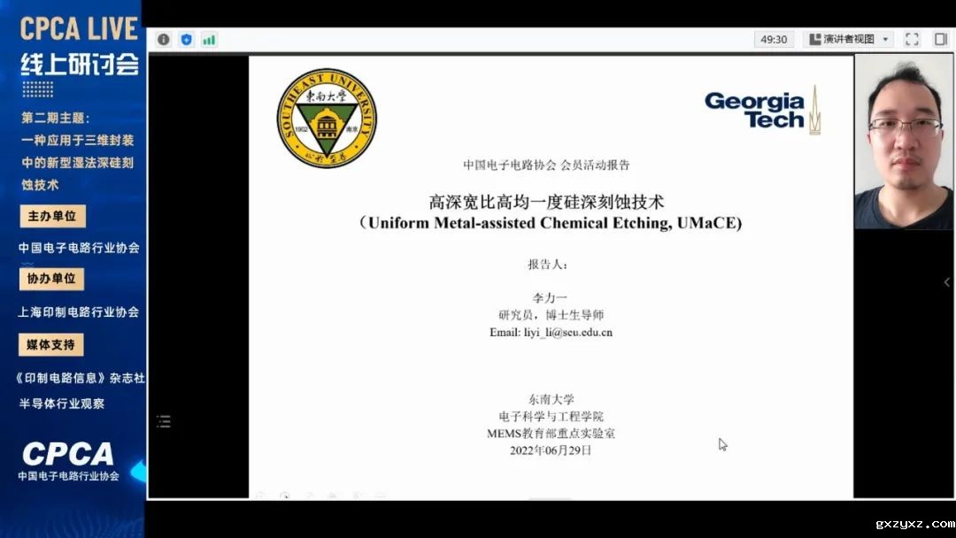 今天下午CPCA Live第二期线上研讨会开讲了。本期研讨会CPCA邀请到东南大学电子科学与工程学院研究院研究员、MEMS教育部重点实验室博士生导师李力一博士,为大家带来 “高深宽比高均一度硅深刻蚀技术” 的主题分享。李力一博士从研究背景介绍、均一性金属辅助刻蚀技术(UMaCE)原理 、刻蚀过程的电荷输运过程-硅基底掺杂影响 、电场辅助UMaCE技术(EMaCE)-三维形状控制、超高深宽比(>100:1)均一性刻蚀 、可控倾斜高深宽比刻蚀、晶圆级刻蚀均一性等方面为大家进行讲解。通过原理理论,讨论主要的实验方法和控制参数及应用,由理论和实际相…